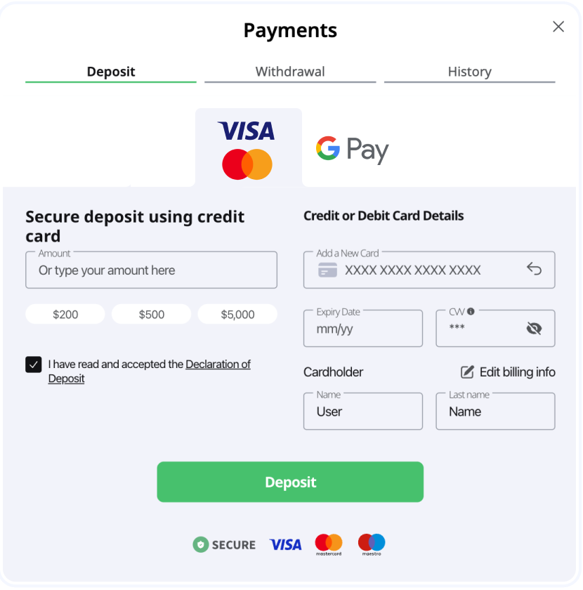 Elige entre una amplia gama de métodos de pago, adaptados a tus necesidades. Desde transferencias bancarias a monederos electrónicos y mucho más, hacemos que los ingresos y las retiradas sean sencillos.